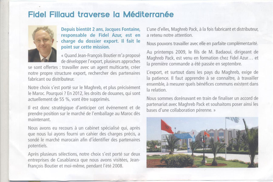 Fidel Fillaud avec plus d’un demi siècle d’expérience en France, environ 3.000 références d’articles de conditionnement et 20 millions d’articles stockés, est le premier distributeur français d’emballages en plastique et en métal. FIDEL FILLAUD a conclu un partenariat stratégique avec notre groupe pour le marché marocain et nord africain, réalisant ainsi une synergie intéressante entre nos activités.